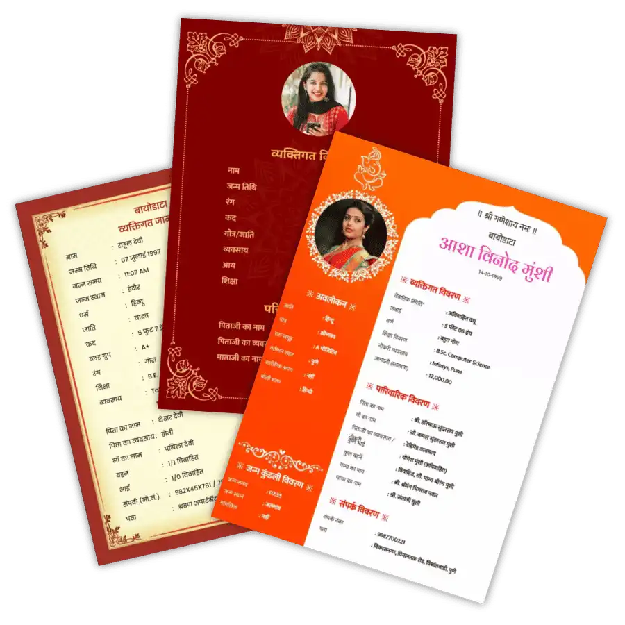 Create a beautiful marriage biodata in minutes. Choose from 50+ designs for Hindu, Marathi, Muslim, boy and girl formats. No sign-up. No watermark.